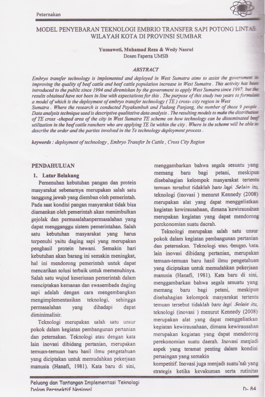 | Vol 10, No 10 (2016): Jurnal Fungsional Dr. Yusnaweti, M.P | Prosiding.MO DEL PENYEBARAN TEKNOLOGI EMBRIO TRANSFER SAPI POTONG LINTAS WILAYAH KABUPATEN PROVINSI SUMBAR | Sari PDF |